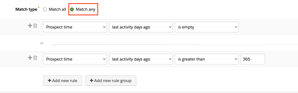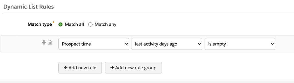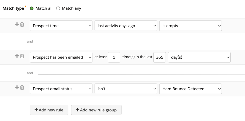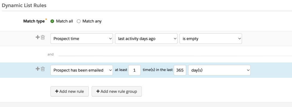 An example is a business who has used Pardot for 5 years and hasn’t cleaned up records since the beginning. Add a second filter to the list that looks like this: Prospect time – last activity – is greater than – 365. Be sure to set the Match Filters on the list to “match any”